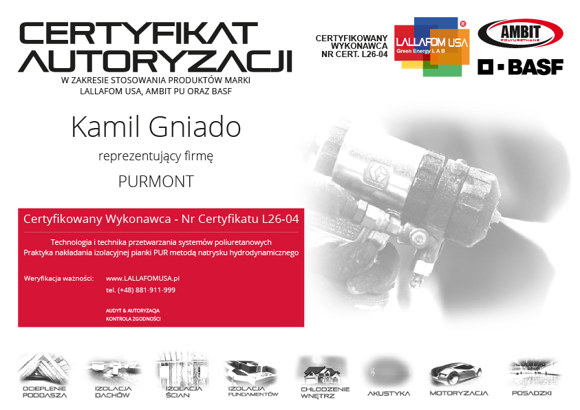 Oryginalne pianki LALLAFOM® USA są do nabycia wyłącznie u Autoryzowanego, Certyfikowanego Wykonawcy. Jeżeli otrzymasz ofertę na te produkty z innego źródła lub będziesz miał jakiekolwiek wątpliwości, skontaktuj się z Przedstawicielem LALLAFOM® USA w Polsce, dzwoniąc pod numer +48 881 911 999 lub wysyłając e-mail na adres info@LALLAFOMUSA.com. Zweryfikujemy wówczas dla Ciebie autentyczność oferowanego Ci produktu oraz kompetencje firmy natryskowej. Bądź świadomy za co płacisz i zapobiegaj łamaniu prawa budowlanego!